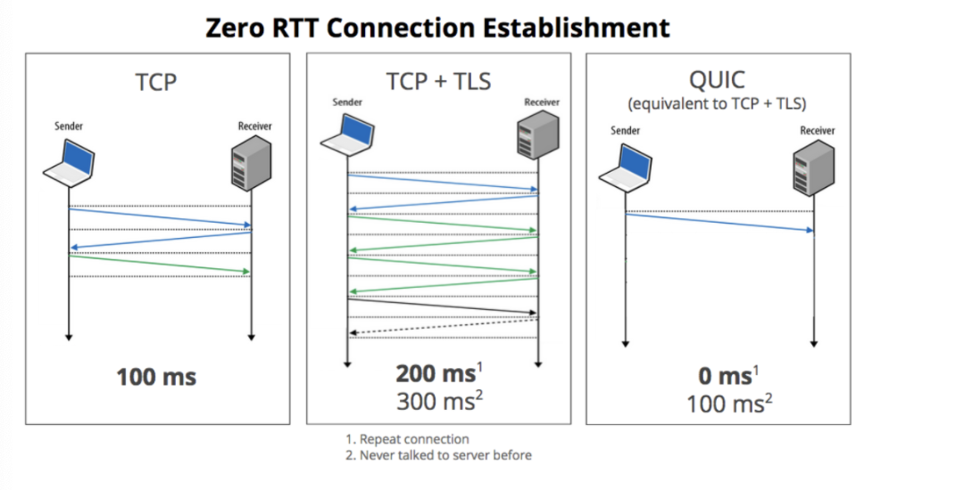 - QUIC ๋ฐฉ์์ด UDP์ ๋ฐฉ์์ผ๋ก Zero RTT(Round Trip Time, ์๋ณต ์๊ฐ)๋ก ์ฐ๊ฒฐ์ ๊ฑธ๋ฆฌ๋ ์๊ฐ์ด ์ค์ด๋ญ๋๋ค.